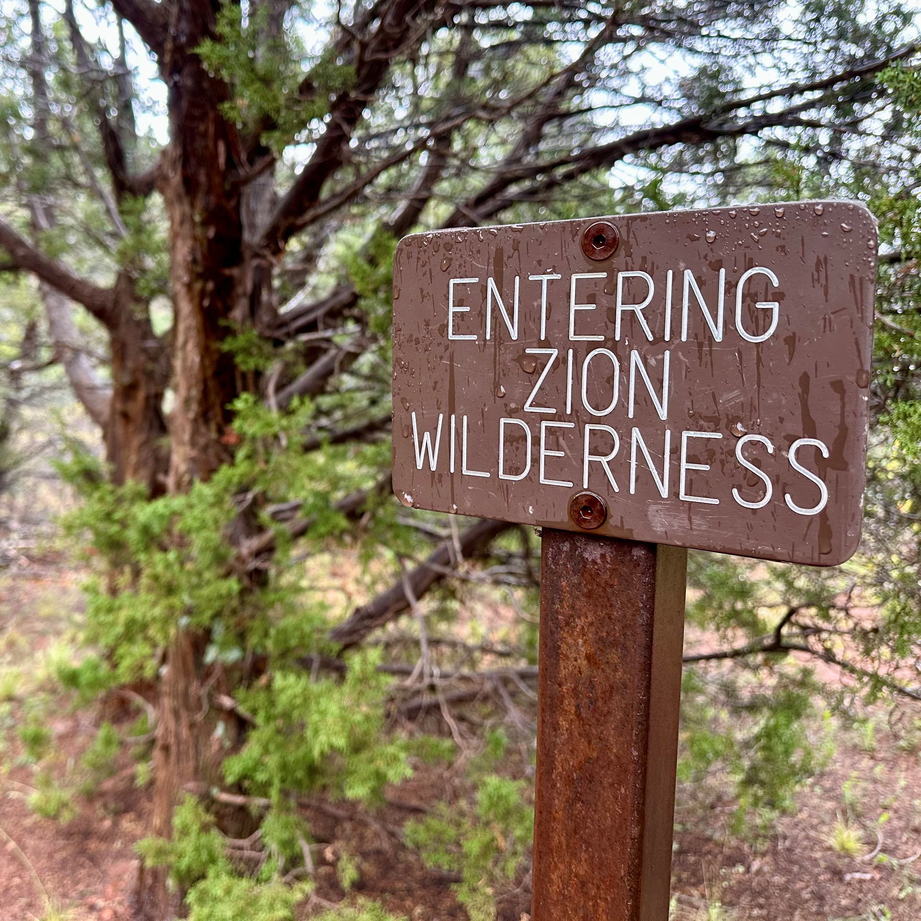 Rain through the night, and drizzling still when we hit the muddy Lee Pass Trail in the Kolog Canyons section of Zion National Park. Even shrouded in clouds, the massive stone walls were stunning.